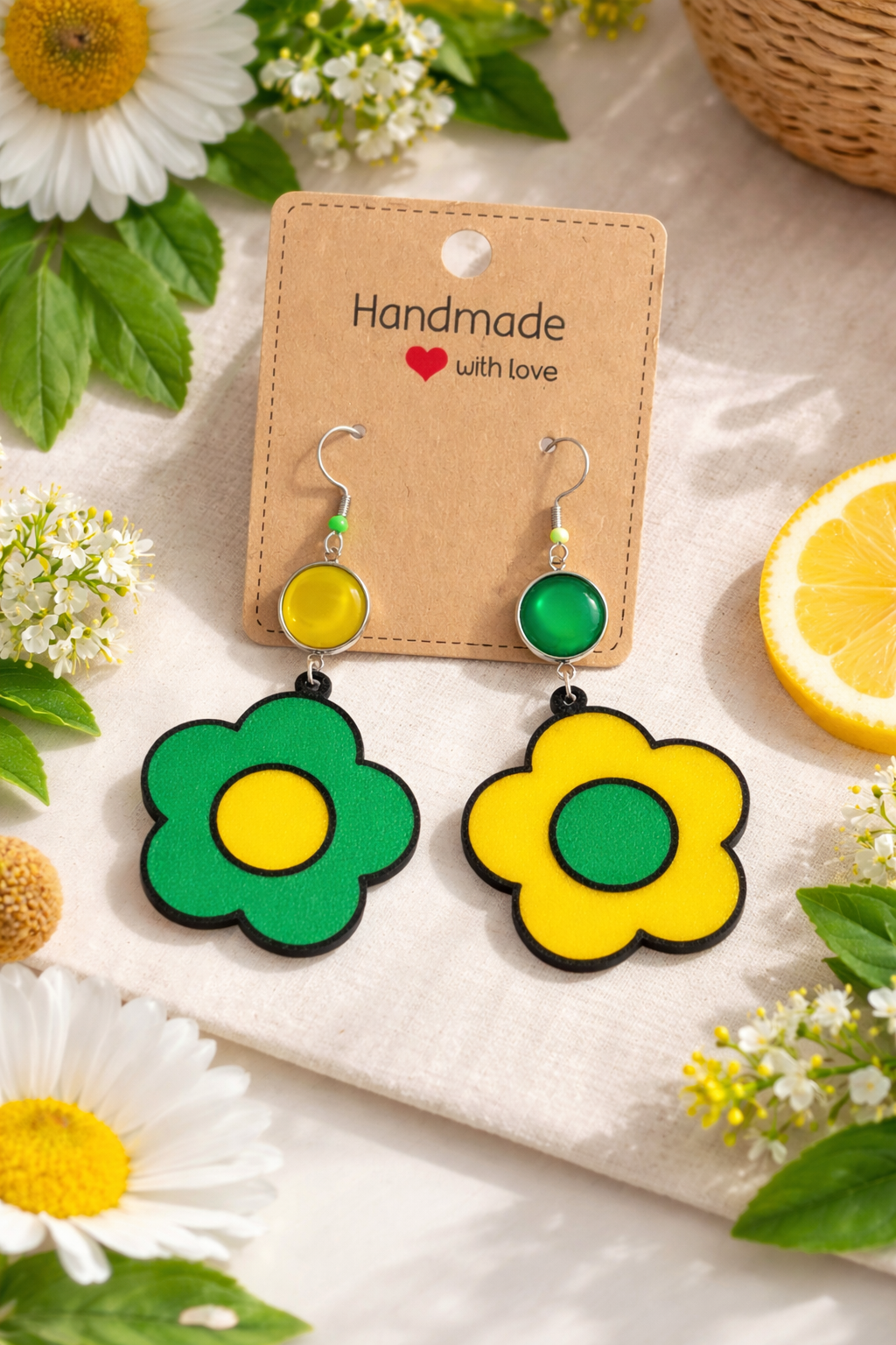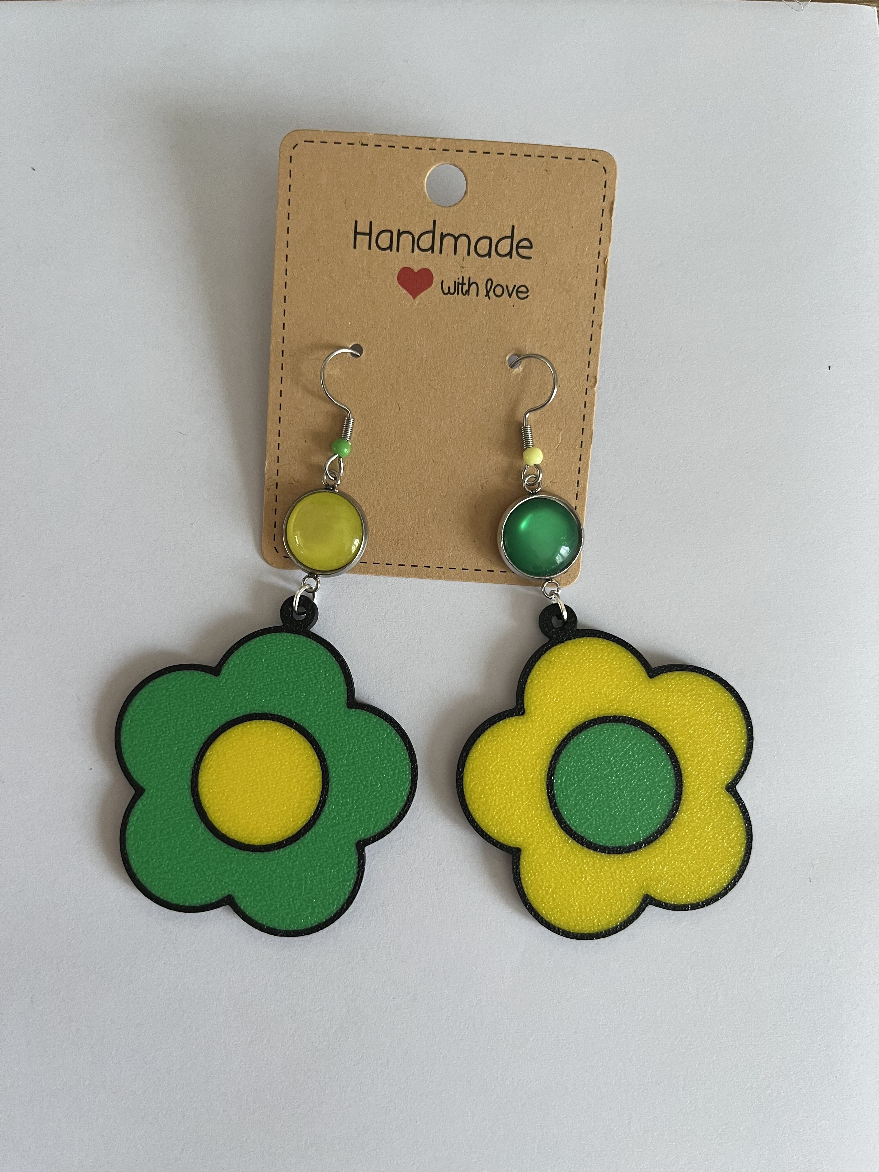 Boucles d’oreilles fantaisies Cabochons 12 mm Neuves Fleurs en PLA biodégradable Diamètre 4,5 cm Légères Jaune et vert