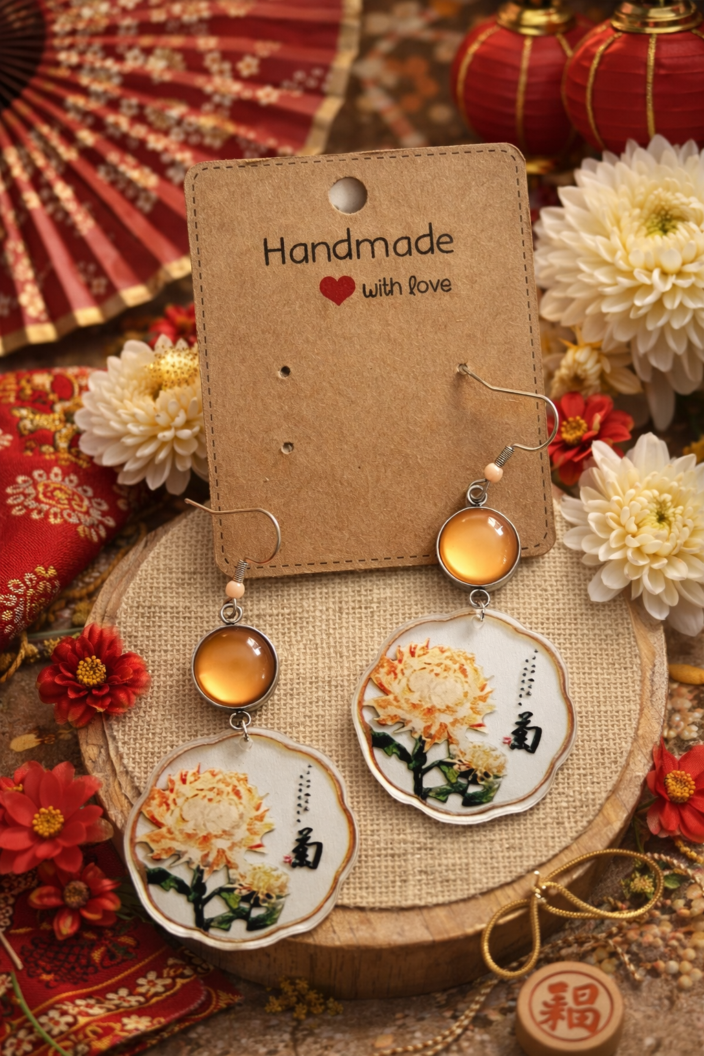 Boucles d’oreilles pendantes composées d’un cabochon rond 12 mm dans les tons ambre et d’une breloque en resine illustré d’une fleur d’inspiration asiatique, avec délicats détails calligraphiques.