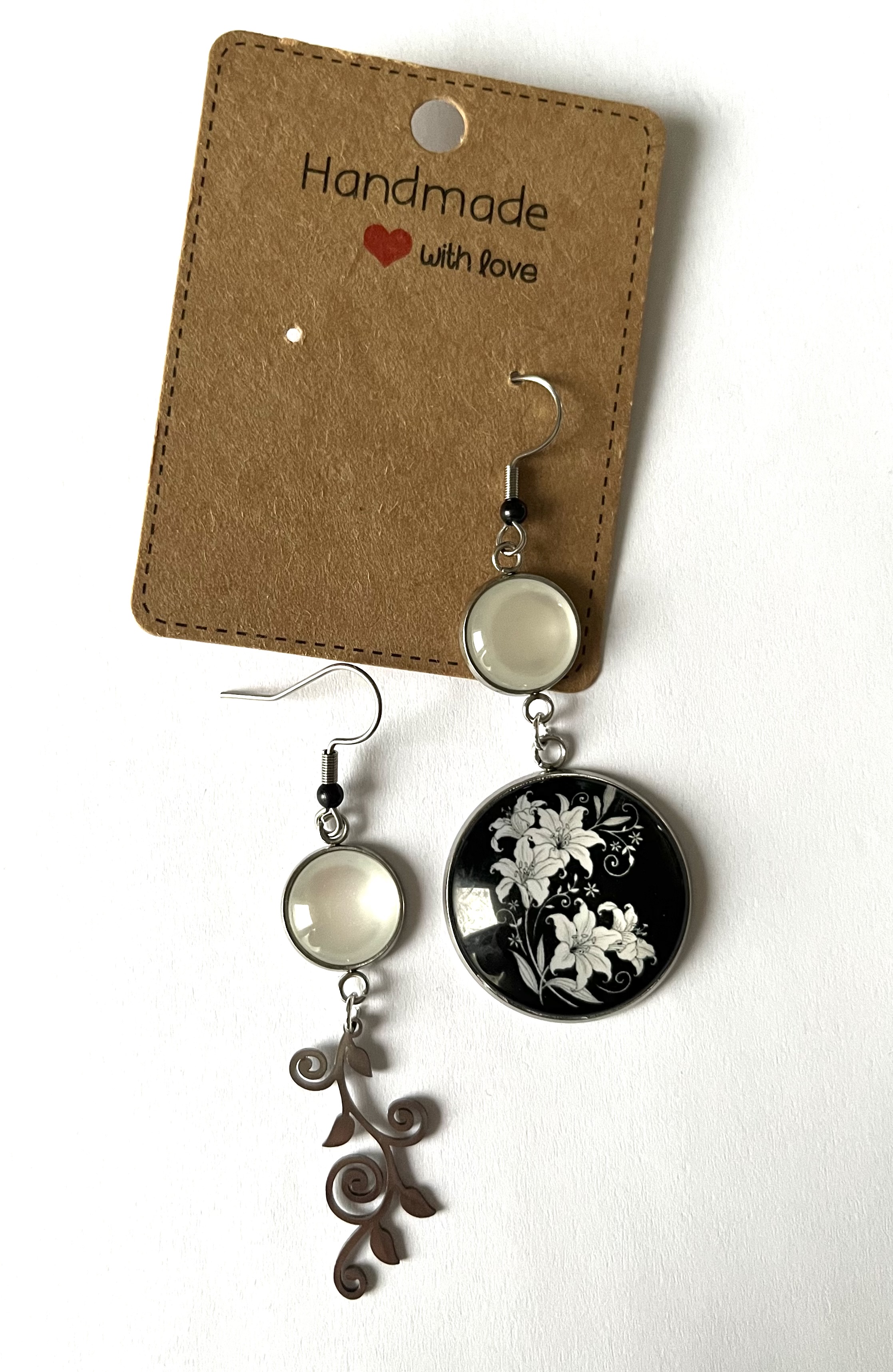 Elles associent un cabochon floral noir et blanc de 25 mm en verre au style vintage avec 2 cabochons effet nacré 12 mm et une délicate breloque végétale argentée.