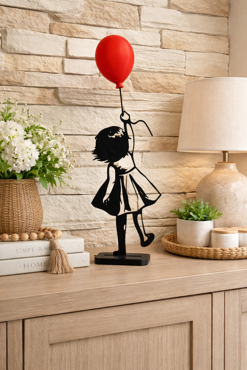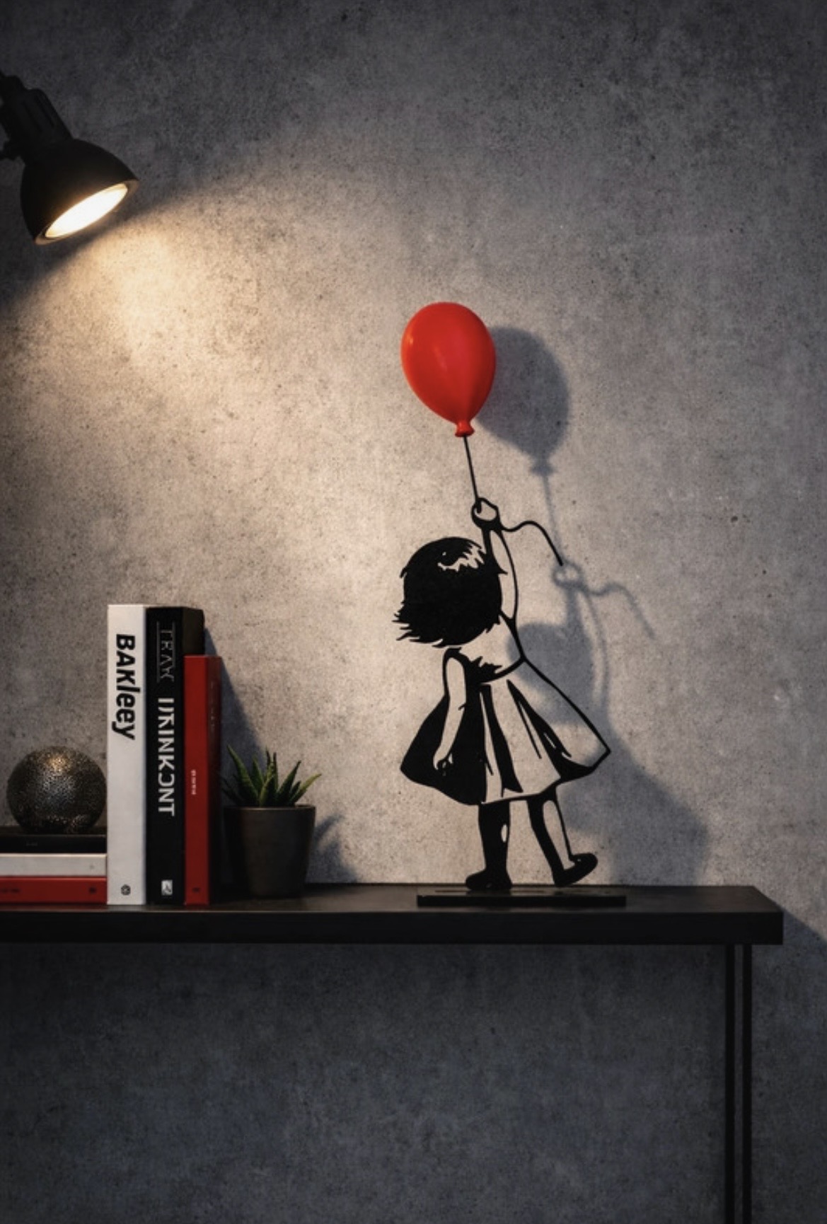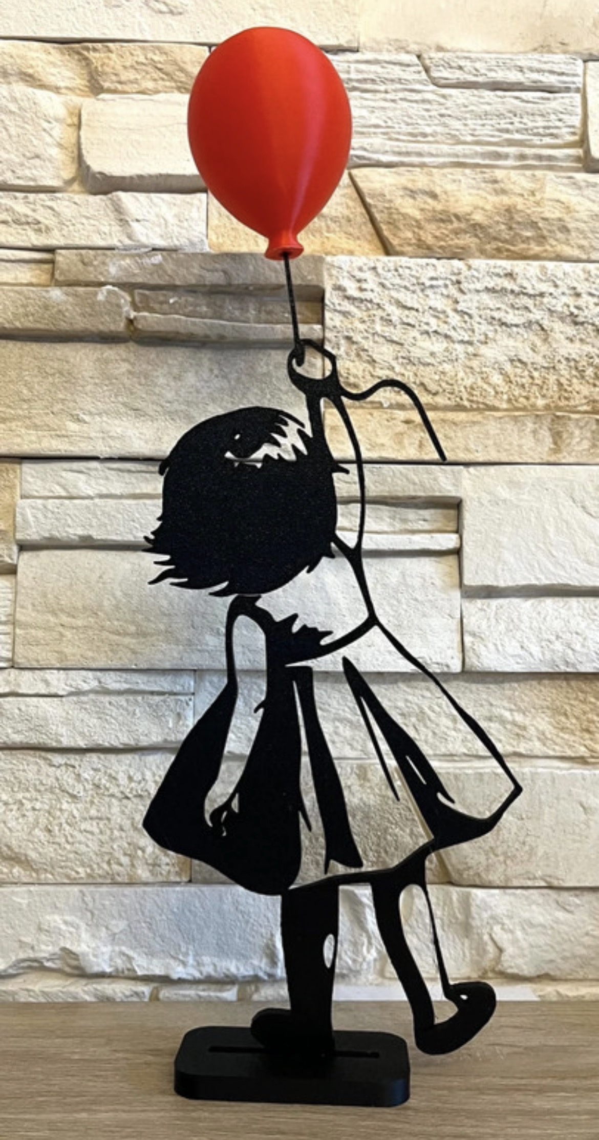 Très jolie statuette décorative représentant une silhouette de fillette tenant un ballon rouge.