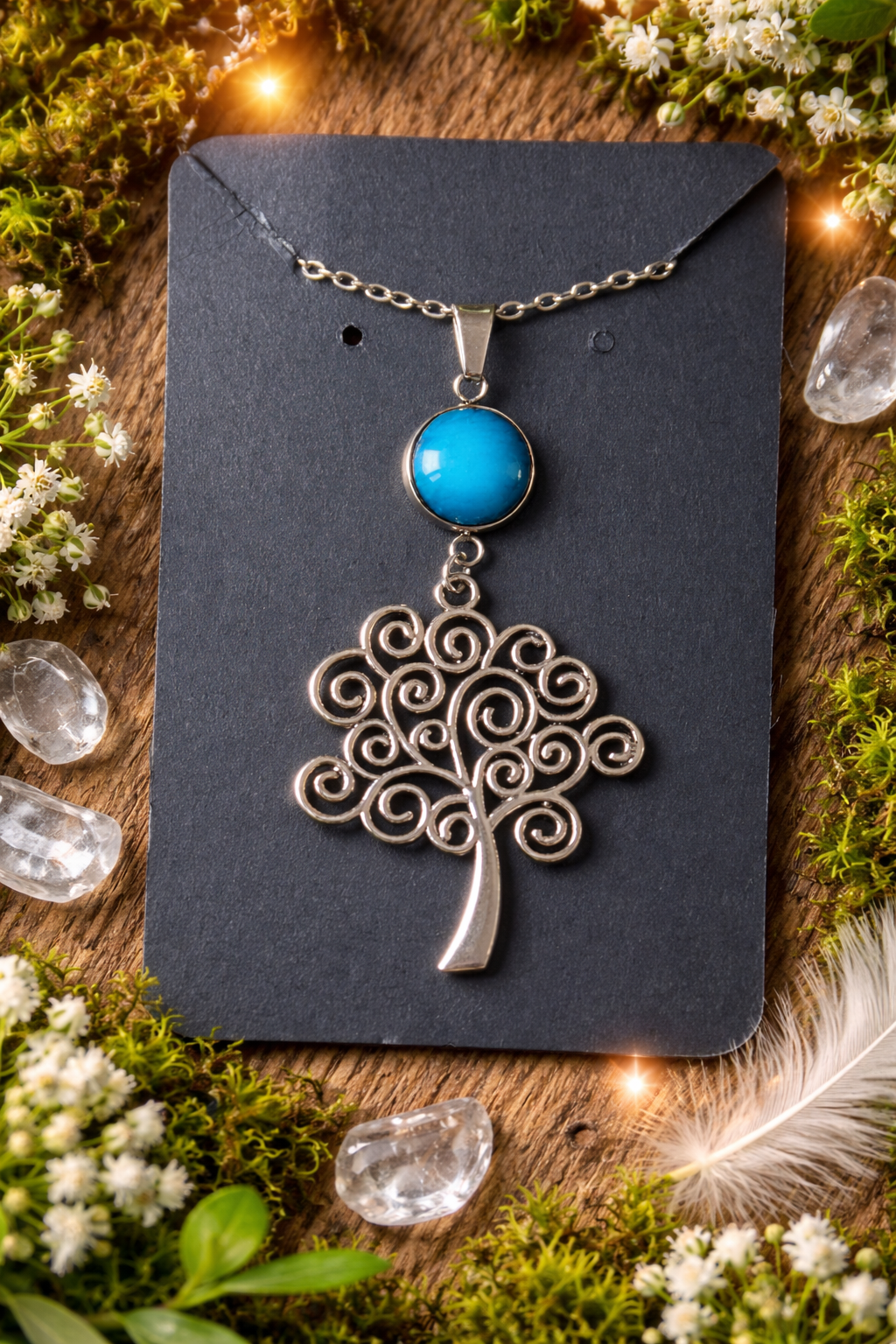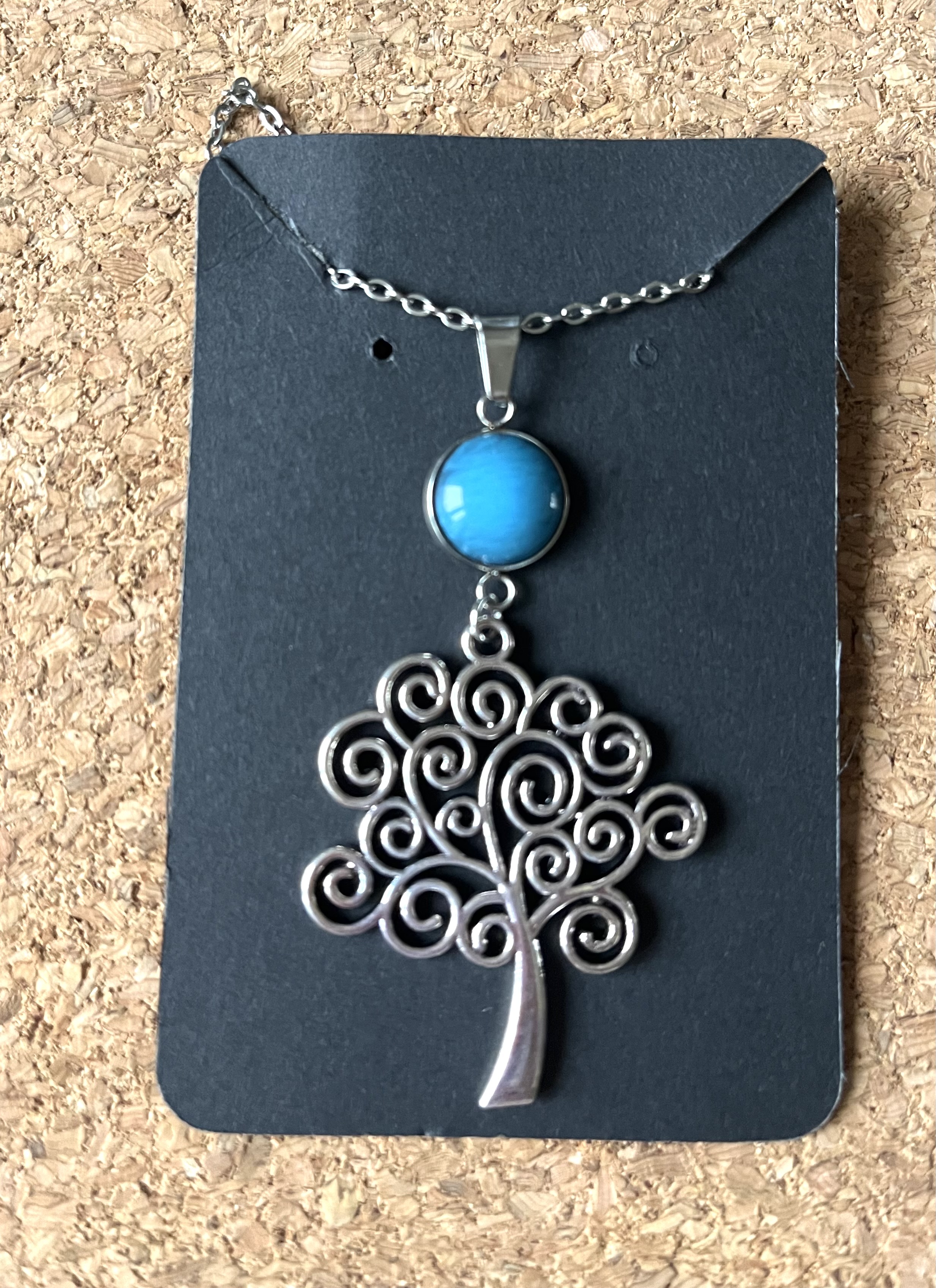 Collier Arbre de Vie & cabochon Pierre Bleue turquoise
