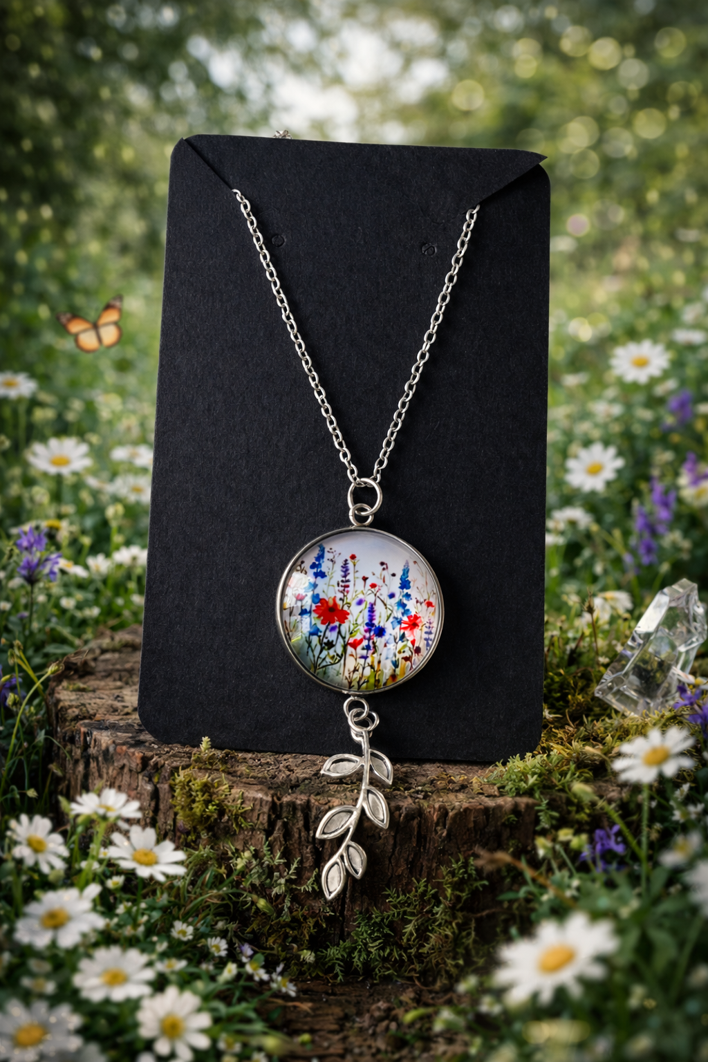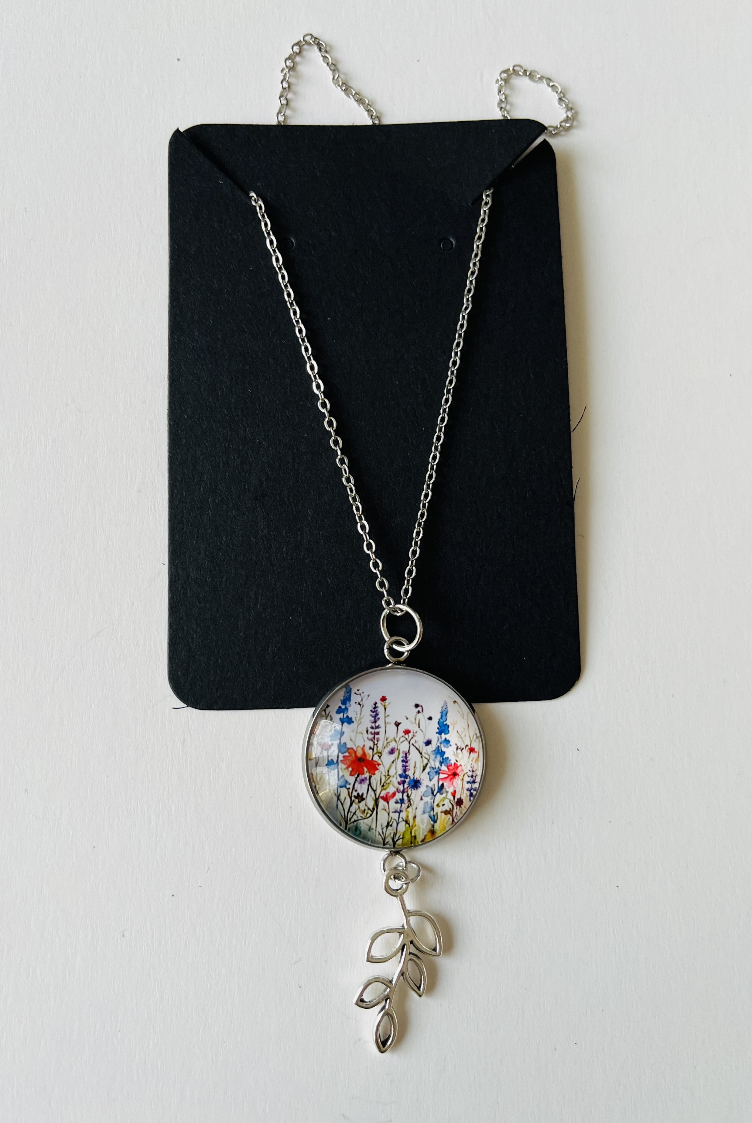 Magnifique collier composé d’un pendentif rond cabochon en verre 25 mm illustré de fleurs sauvages multicolores (coquelicots, fleurs des champs, tons bleus, rouges et jaunes), accompagné d’un délicat pendentif feuille argentée.