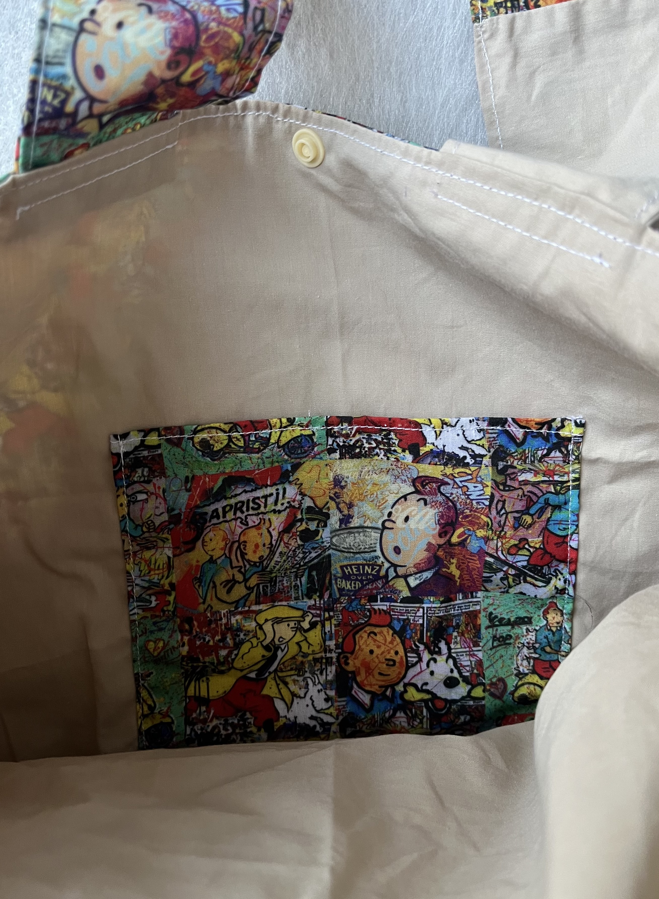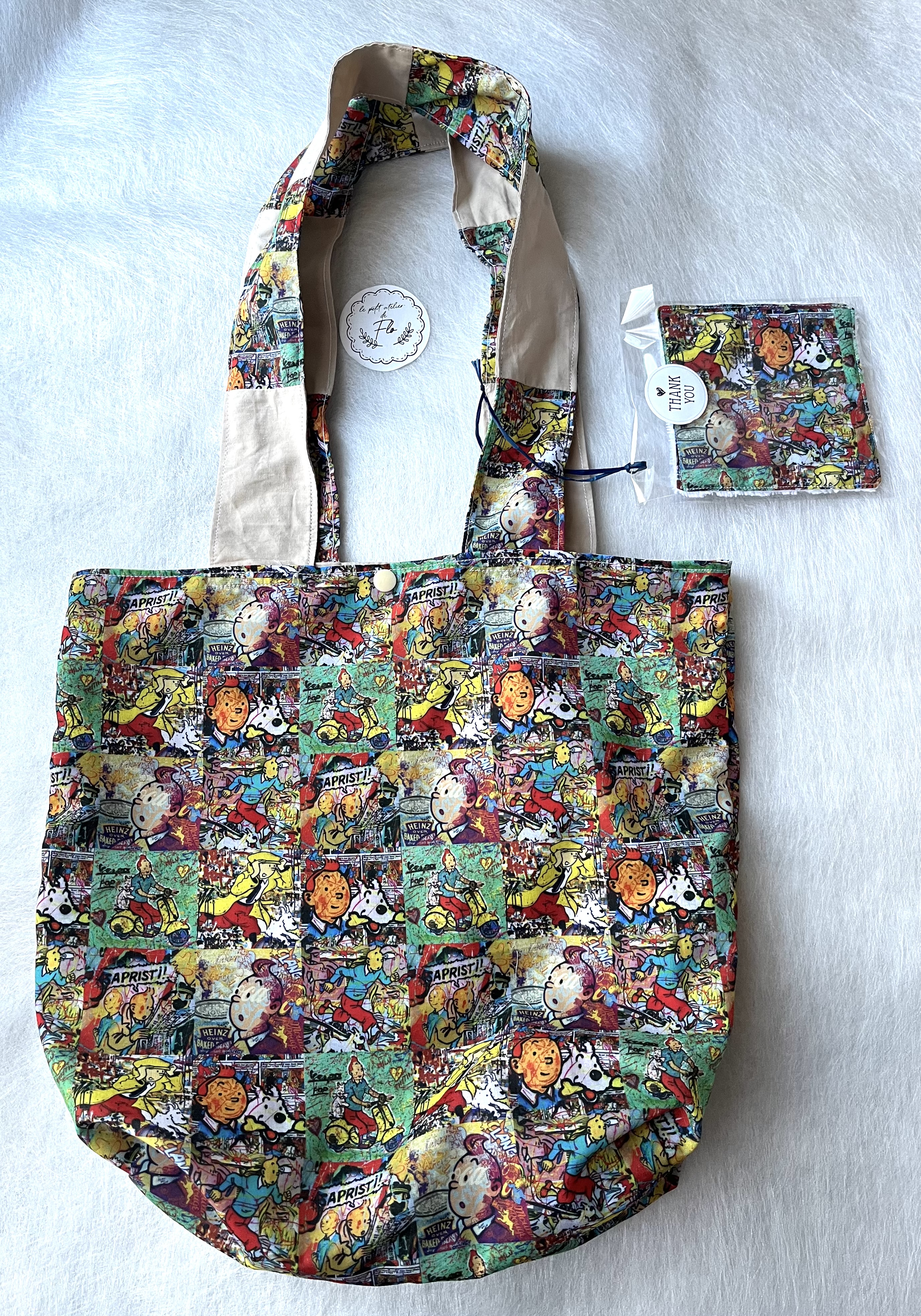 Magnifique Tote bag entièrement fait main, original, avec un superbe tissu illustré inspiré de l’univers de Tintin.